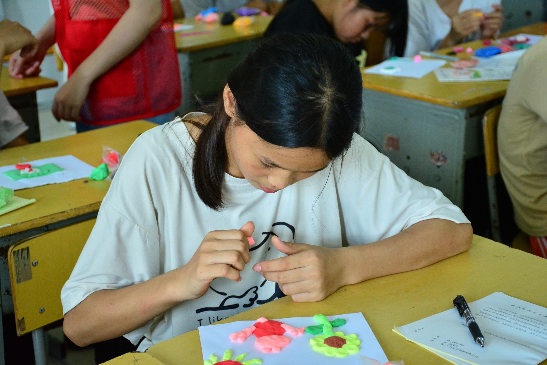 在手工课上,支教组成员们为同学们分发了粘土,认真耐心地教同学们用粘土做出花朵、星球、人物等,同学们在纸上用工具和粘土自由挥洒,创作出了一幅幅充满童趣与想象的作品。