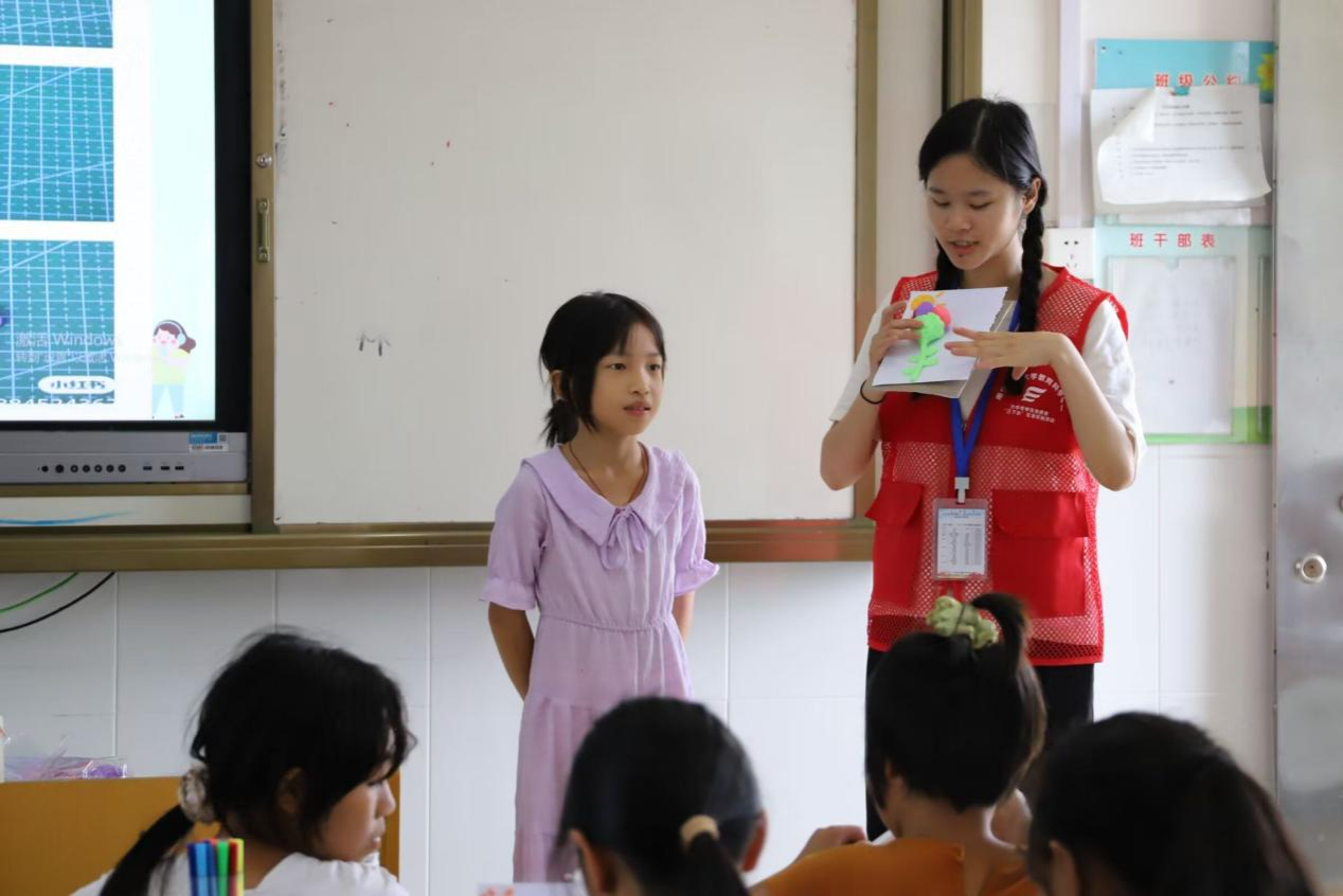图为支教组队员鼓励学生上台展示作品。中国青年网通讯员 邢喆 摄