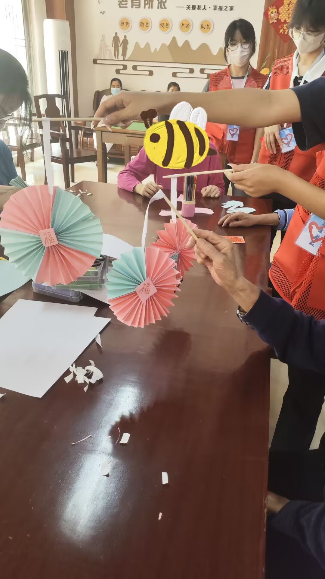 团委社团理事会成员带队,与志愿者们一同按照方案分别老人组和儿童组的活动。与老人进行了“重阳好运投”的投壶游戏,制作DIY重阳灯笼,反应拍拍乐,制作祈愿签,纸杯叠叠乐”这五个有趣的活动。与儿童们开展了“垫球大作战,一二三木头人,接住风火轮,开火车,推车子”活动。志愿者们充满温情与细心地与福利院儿童和老人开展活动,传递人间温情,一同与他们快乐地玩游戏。活动氛围宽松欢快,游戏环节灵活有趣。活动最后,本次志愿活动在所有工作人员和全体志愿者的共同努力下,在一片欢声笑语中圆满结束。大家也积极主动进行合影留念,记录下这美好又温情的时刻。