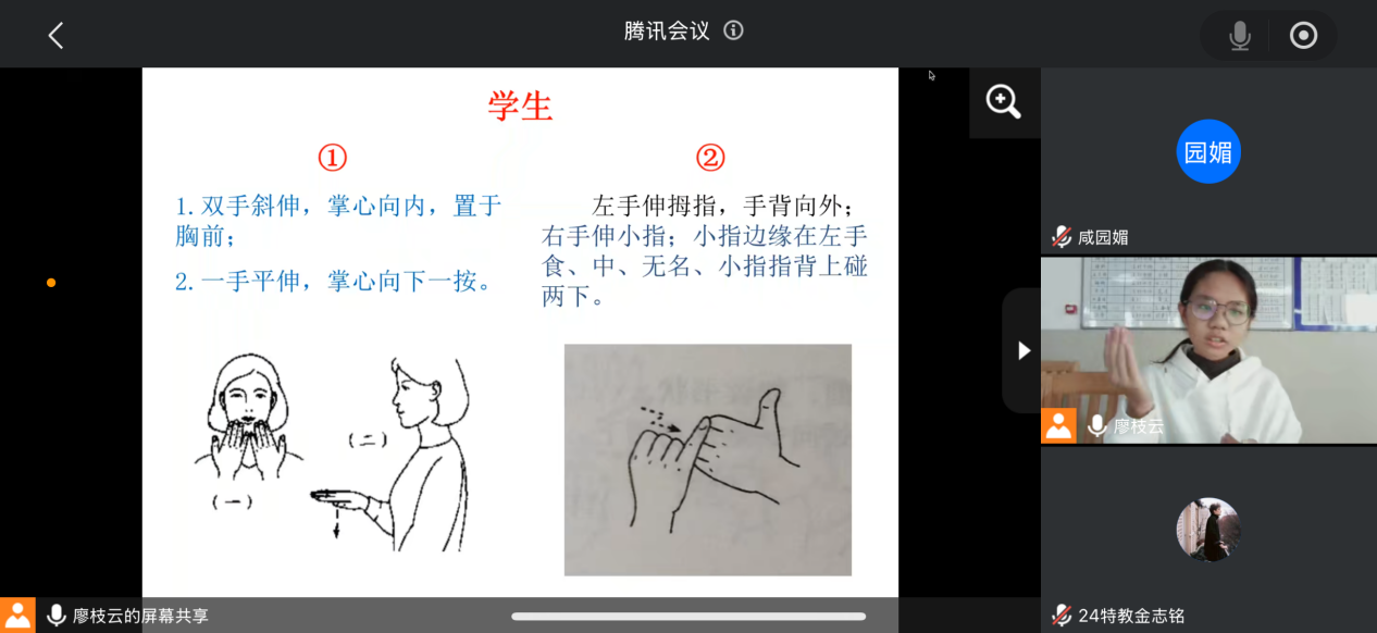 本次手语班共招募了36名同学,活动一共分为四期。第一期由特殊教育专业的授课人员向同学们介绍手语的分类及其基本理论知识;第二期授课老师教授了同学们一些称谓类及其身体类的词语;第三期授课老师带着同学们完整且准确地用手语打出了中华人民共和国国歌。最后一期,授课老师教同学打了一下职业类的词语,并且让同学们总结归纳,同学们纷纷积极地分享了自己的收获以及感悟。