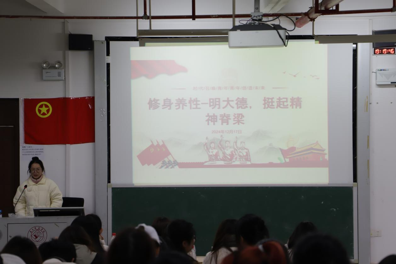 最后,由兼职辅导员陆玲欣进行青年马克思主义者培训工程第五讲上台发言,她借习近平总书记对青年的讲话来引出青年马克思主义者需要“修身养性”的主题。她播放了一些有关朱德、谷文昌和张桂梅等榜样的辉煌事迹的视频,让我们深入感受他们身上的高尚品德,领悟到修身养性的重要性。作为青年马克思主义者,“修身养性”需要我们培育社会主义核心价值观,传承红色精神,积极投身到建设现代化强国的伟业中去。