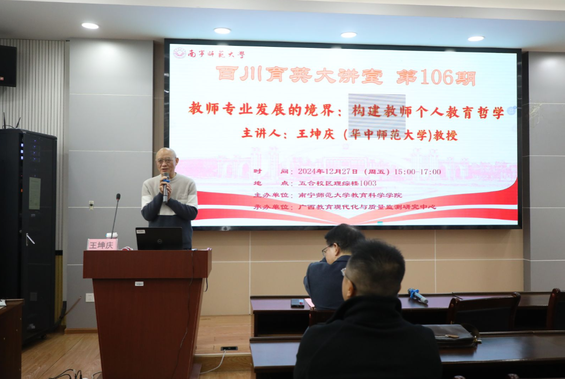 基地、广西教育现代化与质量监测研究中心主办的百川育英大讲堂系列第106期讲座,于我校五合校区理综楼1003室举行。此次讲座特邀华中师范大学王坤庆教授以“教师专业发展的境界:构建教师个人教育哲学”为主题,由少妇色情