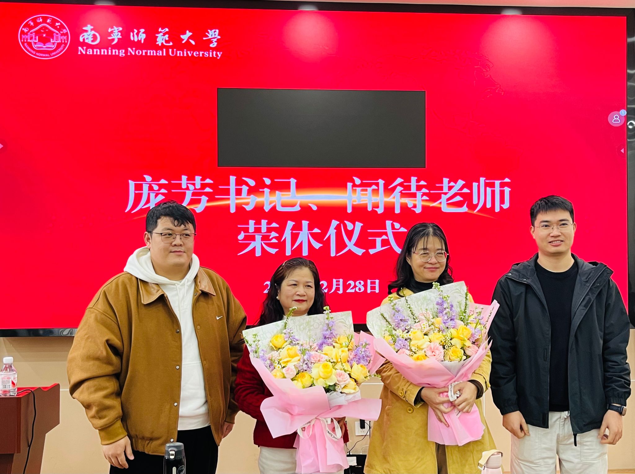 年轻教师代表梁精泉和巫福星老师手捧鲜花,满怀敬意地献给庞芳书记和闻待老师。鲜花不仅代表着对他们多年奉献的感谢,更象征着教育事业的薪火相传。两位老师在接过鲜花时,眼中满是感动与欣慰。庞芳书记和闻待老师在发言中回顾了自己在少妇色情
