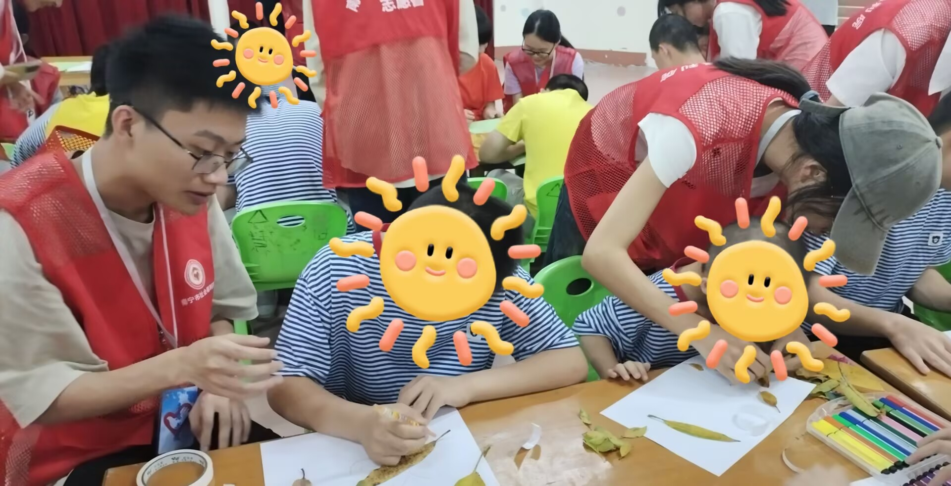 在福利院的户外场地,志愿者们带儿童们一起收集落叶和花朵,进行了自然拼贴活动,让儿童们接近自然,感受自然的美。在自然拼贴画结束后,带领儿童参与触觉寻宝游戏,在院内寻找志愿者们提前藏好的水果玩具,在寻找中提升儿童对物体的认知。