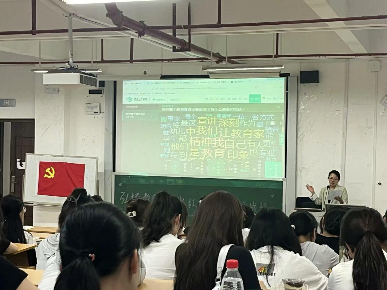 余朝文强调,“教育家精神是中华民族教育事业的宝贵财富,是激励广大教育工作者不断前行的强大动力。青年党员要赓续教育家精神,以红色信仰为底色,在教育实践中践行初心。”鼓励学生党员在学习和实践中传承教育家精神,为以后走上工作岗位做好专业过硬、思想坚定的充分准备。在主题宣讲环节,党员代表或通过视频录制或现场演绎或编排山歌,以“教育家精神与新时代使命”“红色故事润童心,红色基因代代传”等为题,结合陶行知、陈鹤琴、张桂梅、范徽丽、侯莉敏、应彩云、胡华等教育楷模事迹和幼儿园一线教师党员的工作事迹,阐释教育家之光、教育家精神的时代内涵。之后,师生党员还围绕“如何将教育家精神融入学业与职业规划”展开讨论,每个人将感受与收获发布到微助教平台。