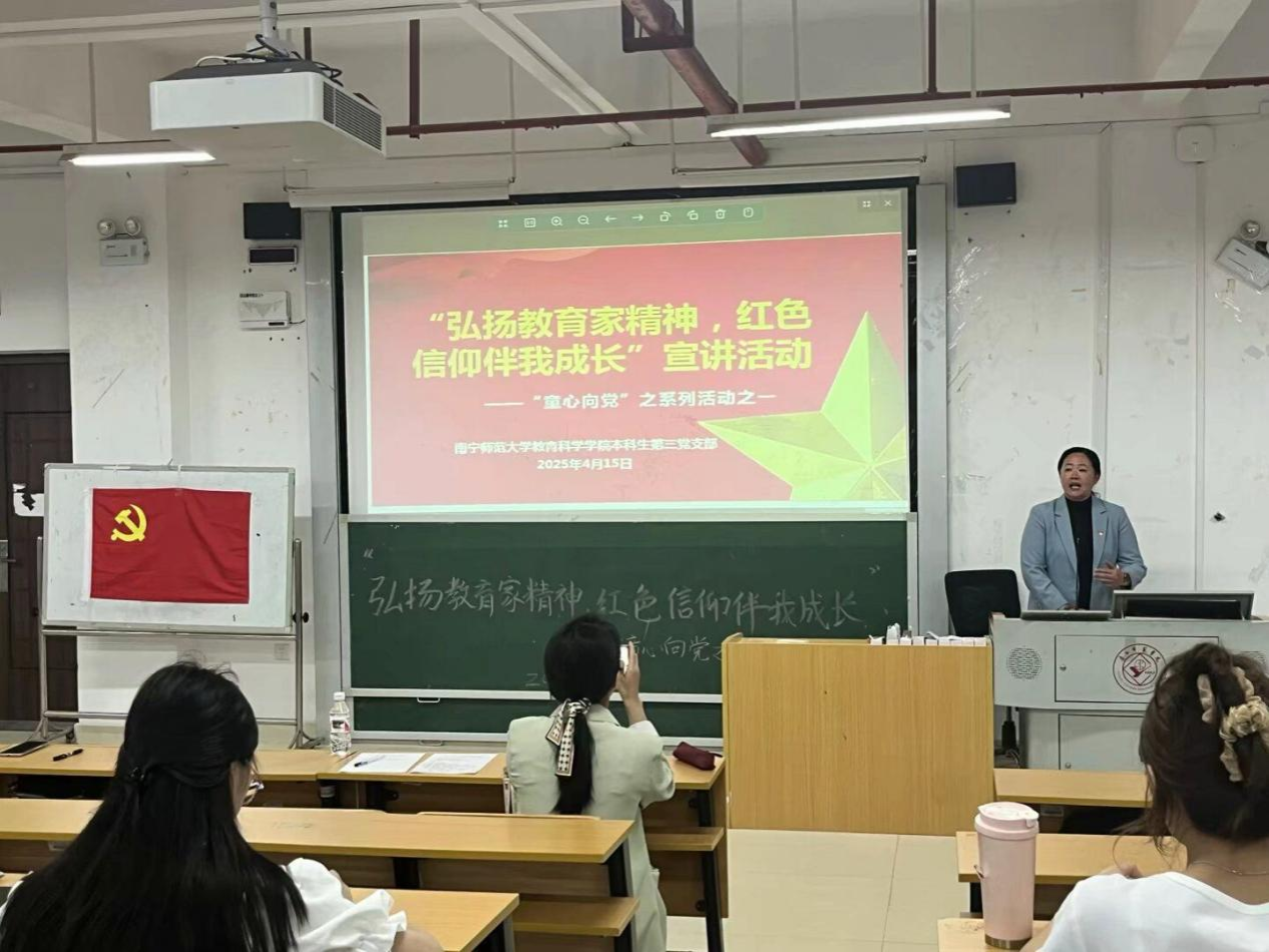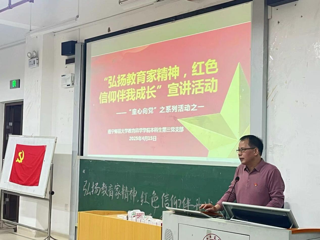 本科生第三党支部在五合校区文综415教室开展了“童心向党——弘扬教育家精神,红色信仰伴我成长”主题教育活动。学院党委书记余朝文、党委副书记谢珊、学前特教教工党支部陆春行老师、本三党支部书记李新园参加本次活动,参加活动的还有本科生第三党支部全体党员同志、本科生第一党支部中共党员同志代表和本科生第一党支部中共党员同志代表。