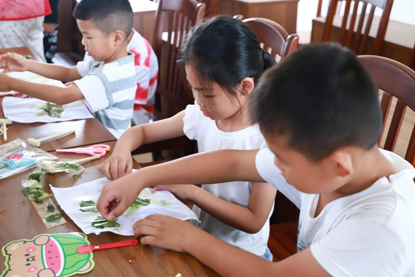 “情暖童心护成长”星火班开营班会如期而至,从心灵成长到文化体验,从艺术创作到推普学习,丰富的内容让教室里瞬间沸腾起来,孩子们的欢声笑语此起彼伏。当《五星出东方》的旋律响起,孩子们挺直小身板,用稚嫩却清亮的嗓音合唱。歌声里有对祖国的懵懂热爱,也有与老师间悄然滋长的默契,一堂爱国教育课在旋律中自然流淌。拓印课成了最热闹的时光。老师们把从大自然中取材,树叶、花瓣分发给孩子们,演示如何利用植物拓印。在这个过程中,孩子们不仅受到了美的熏陶,感受到了手工艺术的魅力,也在动手中锻炼了精细动作和创造力,体验到了动手实践的乐趣。普通话课上,老师以生动的视频让孩子们明白学好普通话的意义。诗歌朗诵与绕口令挑战轮番上演,孩子们争相举手,用清脆的声音演绎语言的韵律。作为国家语言文字推广基地的实践活动,这堂课让孩子在趣味中感受普通话的魅力,为乡村振兴种下语言沟通的种子。窗外,龙岸镇天宝村驻村第一书记巫福星与不少家长被这份专注与热情吸引,悄悄驻足凝望,目光中满是欣慰。