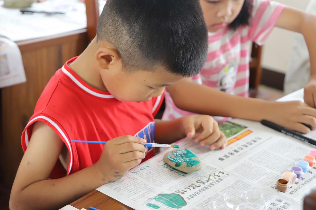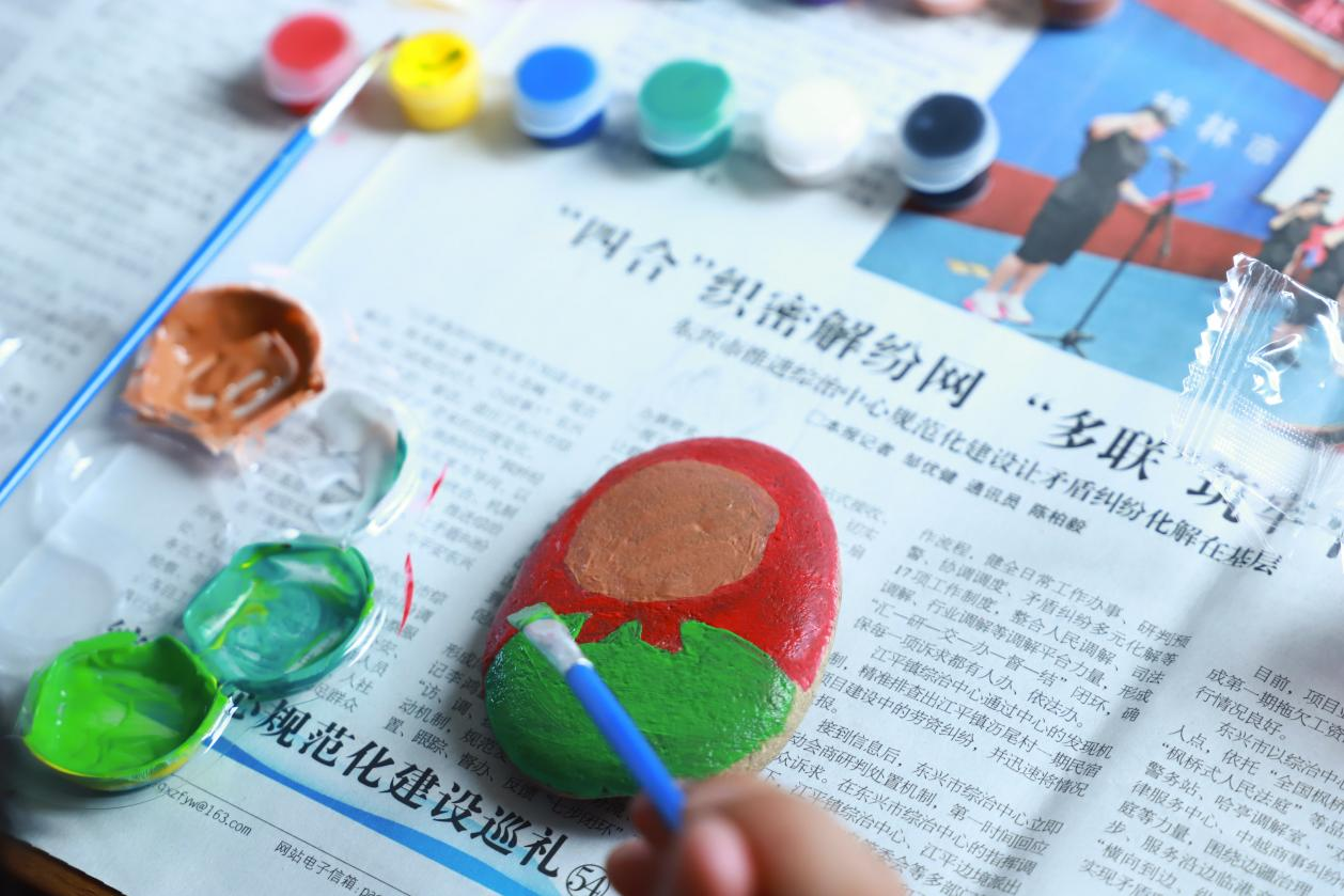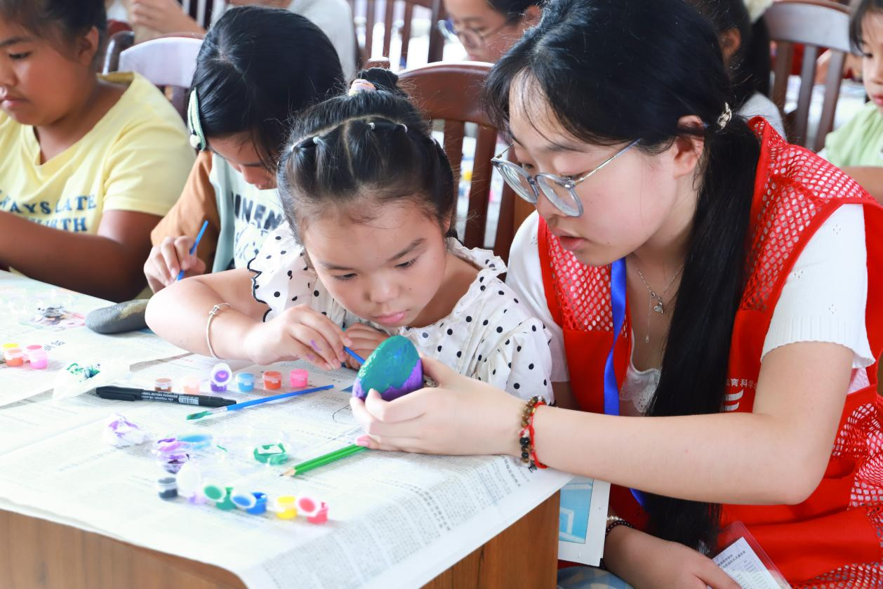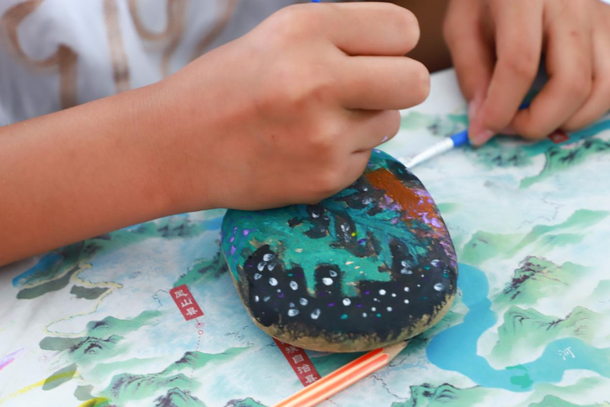 “情暖童心护成长,爱润乡土助振兴”社会实践团的志愿者化身创意导师,带领天宝村的学生们开启石头绘画课。大家以石为纸、挥笔创作,缤纷色彩与灵动线条,让普通石块蜕变为童趣满满的艺术品。