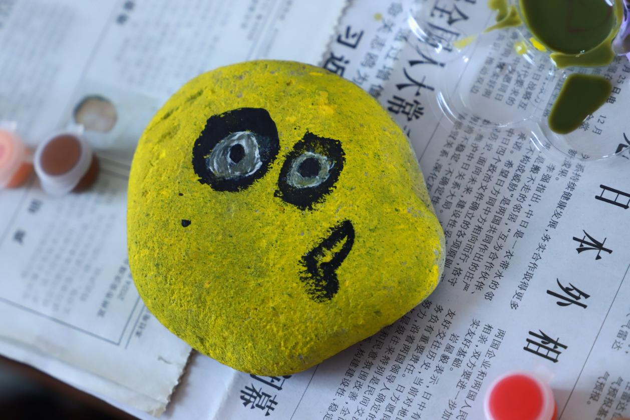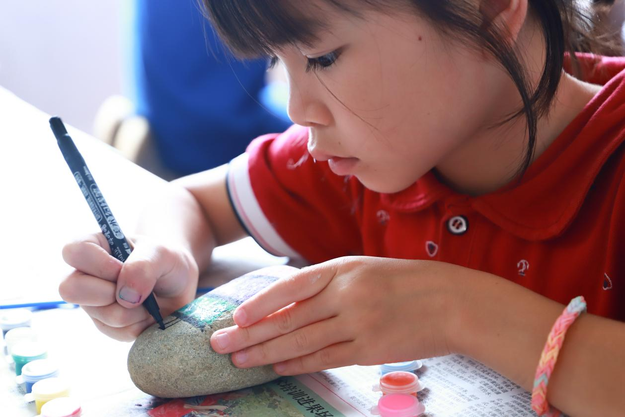 在成果展示环节,大家小心翼翼地捧着自己的 “石头艺术品”,向老师和同伴们介绍创作思路:“我画的是蛋糕,因为我喜欢吃蛋糕”“这颗石头像粽子,所以我画了粽子”“我把喜欢的图案 组合在一起,觉得这样很有趣”……