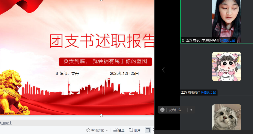12月25日晚,少妇色情 团委开展了2025-2026学年秋季学期团支书述职大会,本次大会通过腾讯会议平台进行。会议的第一环节由各班团支书依次进行述职发言,各班团支书通过PPT等形式,展现了各团支部在组织建设、思想引领、服务青年、特色活动等方面的工作成效。会议第二个环节由各班团支书进行经验交流,大家相互借鉴、互相学习,寻找自身的不足和对照优秀团支部学习。