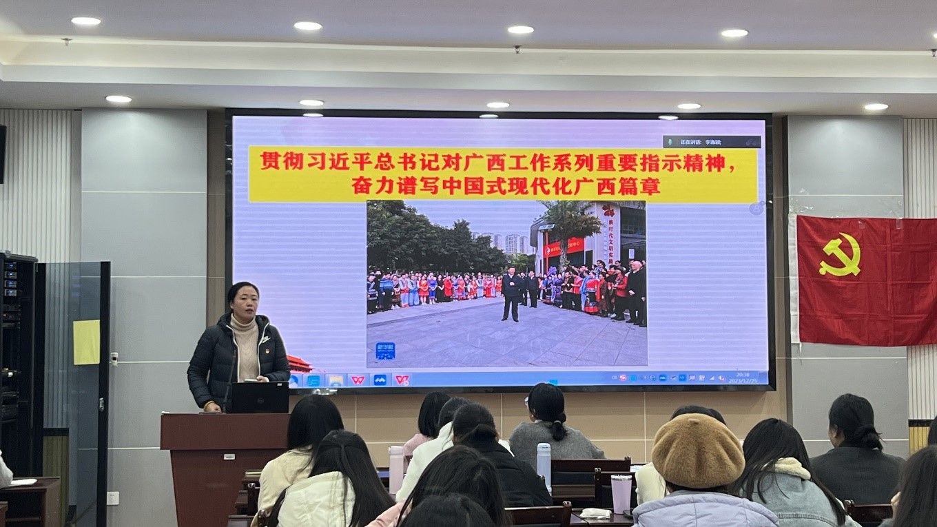 党委谢珊副书记在五合理综1003室为学院研究生第一党支部讲授主题为“贯彻习近平总书记对广西工作系列重要指示精神,奋力谱写中国式现代化广西篇章”专题党课,该支部全体党员和入党积极分子参加了学习。