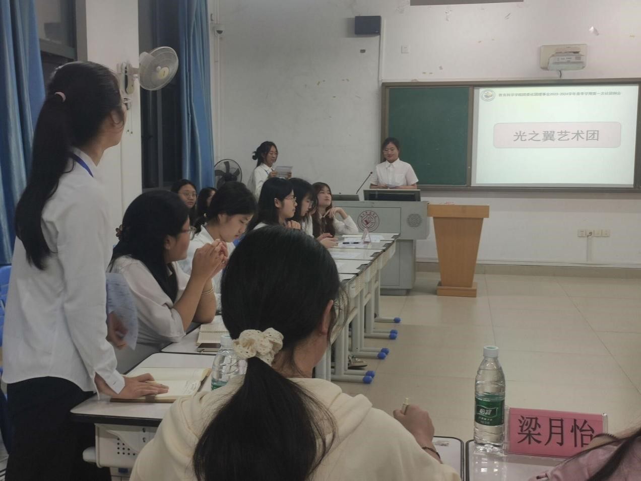 辅导员郭恒老师、兼职辅导员梁月怡、团委副书记韦海娇、罗文玉、卢楚烨以及社团理事会全体成员与五大社团委员、干事到达现场。开场白之后,光之翼艺术团、青年志愿者协会、心理健康协会、学生公寓管理委员会和阳光特教社的社团负责人依次上台进行发言,总结了其社团的工作。接着便是各社团的自由交流环节,众人各抒己见,现场热闹非凡,氛围轻松愉悦。最后,郭恒老师对我院五大社团的工作在时间安排活动审批备案、活动的实践性与知识性相结合、开展活动的目的重心点等方面给出了中肯的建议与指导,为各社团后续活动的开展提供了新思路,令各社团收获颇丰。